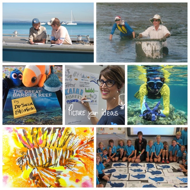 I’m excited to share that over the next six months I will be visiting schools and holding workshops around Australia about Our Living Oceans as my alter ego Dr Suzie Starfish. Using the art of marine science I will be bringing science stories of the sea indoors for kids of all ages! I use a range of interactive approaches to engage with students and kids as we all think and learn differently. So I use a combination of visual storytelling, multi-media and hands-on Sci-Art activities, like the always popular “Shark Art”! I also hold ‘Sketchnote your science’ in schools for students and teachers to help make learning and science visual, as “when you draw you remember more“!! I also hold workshops for teachers to learn the ‘art’ of sketchnoting your science as part of their Professional Development.