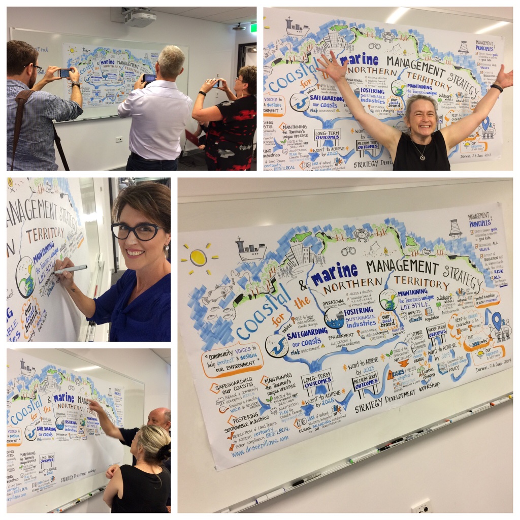 I am so lucky in my job to be able to draw out ideas in great places with passionate people and drawing in the Top End is always a great experience! I was recently part of an experienced team of consultants engaged by the Northern Territory Government to help facilitate (and picture) stakeholder discussions to develop the Territory’s first Coastal and Marine Management Strategy. The Strategy will ensure the health and viability of the Top End’s coast and seas, support their use by Territorians for recreational and cultural purposes, manage growing demand for natural resources and foster sustainable industry. The development of this Strategy is a work-in-progress and it was a great privilege for me to picture these initial and important discussions with stakeholders.