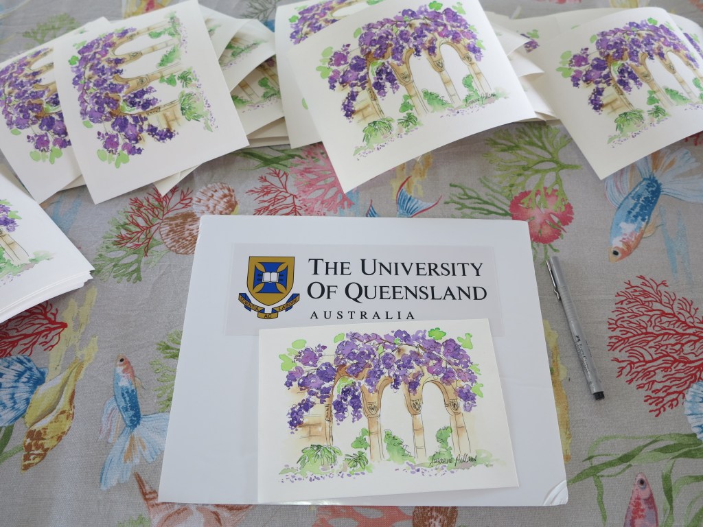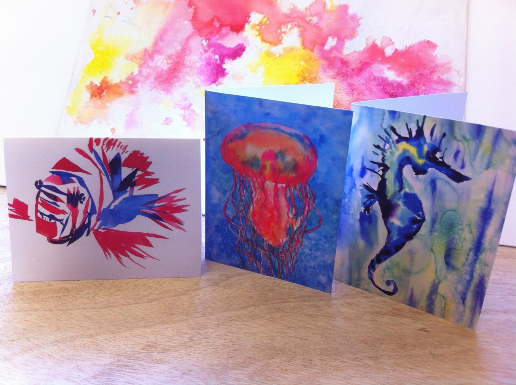 I have recently expanded my artworks into printed and hand-painted gift cards of marine creatures and fashion frocks. A percentage from the sales of all of my fashion artworks go towards the cancer care initiative Look Good Feel Better Australia.