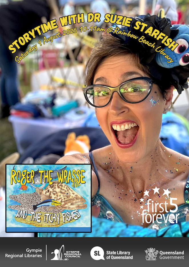 You can BUY signed copies of this book directly from me by emailing me at drsuepillans@gmail.com to arrange a bank transfer and delivery details, and I will address the book to a little starfish in your life and sign the book (with International orders through my Publisher at https://littlepinkdogbooks.com/roger-the-wrasse-and-the-itchy-fishes/).