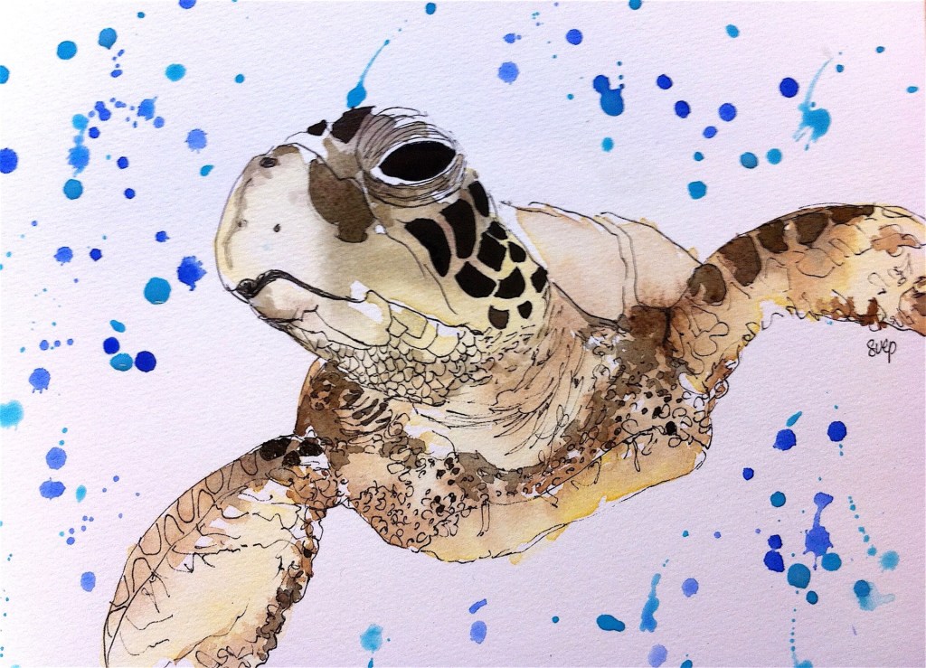Green turtles (Chelonia mydas) nest along Rainbow Beach, my original pen and watercolour painting