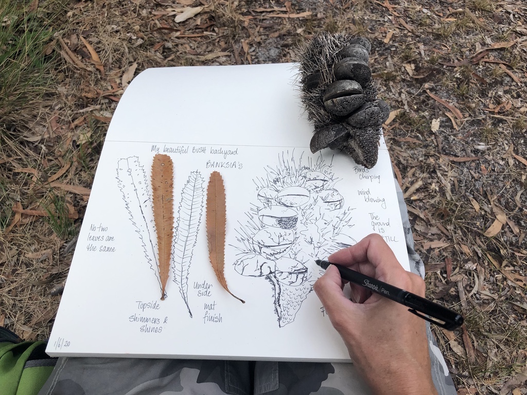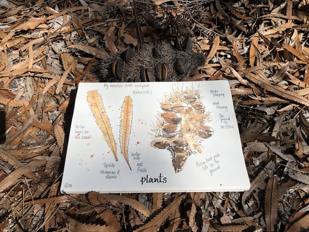 Nature journaling: As I’m drawn to nature it was a logical next step to take up nature journaling in my happy place. Nature journaling allows us to open ourselves up to the wonder of our natural world and explore it with joy. This is about curiosity, mindful observation and taking the time to enjoy your surroundings, wherever you are or wherever you go. There are no rules here, your connection with nature is what is important, not creating works of art. All you need to start is a pencil/pen and hard booked notebook, walking shoes, hat and sunnies, and you can make a date with nature and carry it around in your pocket.