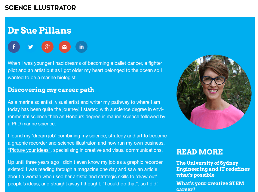 I love sharing my creative journey and how I now live my life with ESTEAM with all students, parents and teachers. As a women-entrepreneur I truly believe that girls with dreams become women with vision so I’m passionate about encouraging our young girls to follow their dreams. I didn’t even know my job of graphic recording even existed eight years ago and never thought owning my own small creative business was something I could do, and be successful at! I’m part of the below STEM/STEAM programs so please Contact me if you would like to discuss me visiting your school or youth group to discuss my journey and life of ESTEAM. There are many ways to communicate these days so no matter where you live in the world we can make a connection, whether that be via email, online chat platforms or via social media etc.