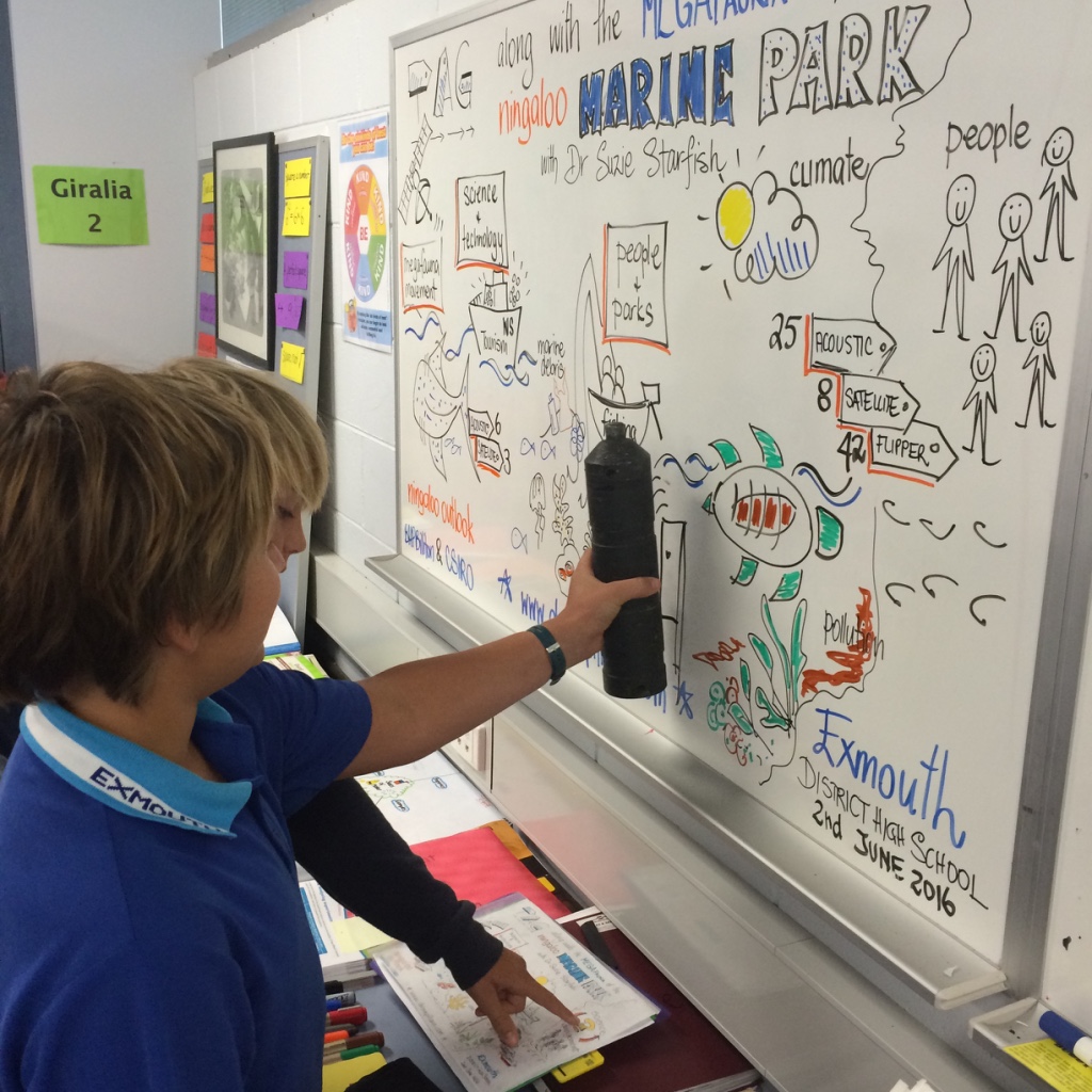 As my alter ego Dr Suzie Starfish I graphically record my science visits with High School students to provide a more interactive and creative thinking approach to my school incursions — about the science of our Living Oceans. I also deliver Sketchnote your Science in School to students and teachers to help visualise science. These visual thinking approaches really engage with the students AND the teachers as ‘Drawing is Thinking‘. Graphic Recording and Sketchnoting in an educational context can provide students with the following learning outcomes: