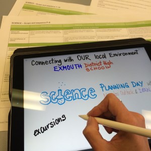 As part of my work with CSIRO and BHP on the Ningaloo Outlook project I recently visited with the High School science teachers of Exmouth District High School to discuss further how my science incursions could use more graphic recording to help with science learning and retention. As you can see below we were all smiles talking creative science and of course I had to ‘picture’ our groups science ideas!