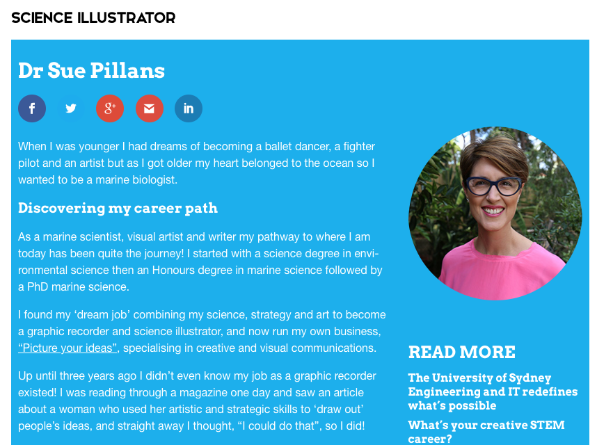 My Art & Science, thrilled that my journey as a science illustrator ‘drawing’ on my experience as a marine scientist, artist and visual communicator was profiled by Careers with STEM. ‘Sea’ how I went from wanting to be a ballet dancer and fighter pilot to using the art and science of marine storytelling to share my devotion for the ocean.