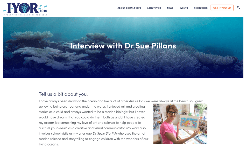 The International Year of the Reef, an interview sharing the story behind the story of my first children’s picture book, “The Great Barrier Thief” at https://drsuepillans.com/books/the-great-barrier-reef/. You can ‘sea’ more about my ocean storytelling via the interview at https://www.iyor2018.org/news/interview-dr-sue-pillans/