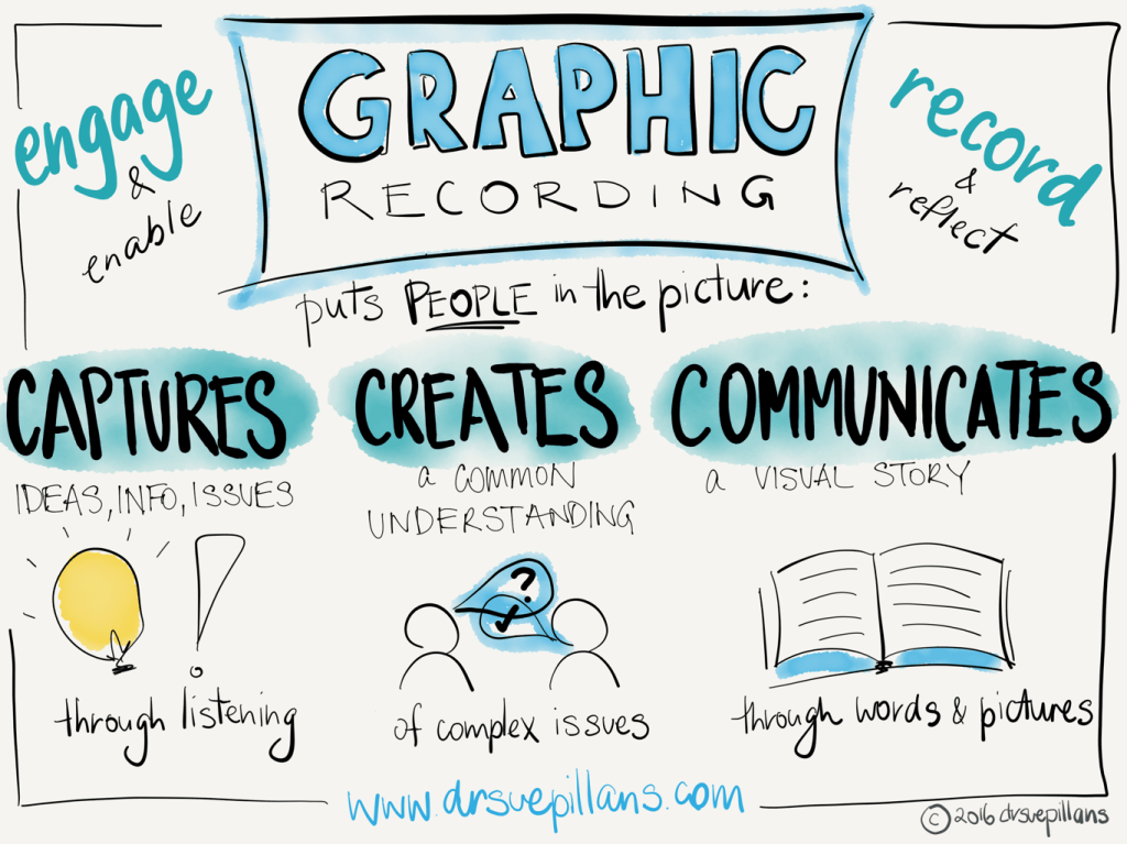 What is Graphic Recording and how can it help you to “Picture your ideas“? Graphic recording is a form of visual storytelling that will help you to better engage with your stakeholders, clients, students and audiences and show them, literally, that they are being listened to? Graphic Recording is a way of visually capturing and conveying discussions and can be done in real-time at events, meetings, teleconferences etc AND remotely via teleconferences, online streaming services and meeting notes/video’s etc.