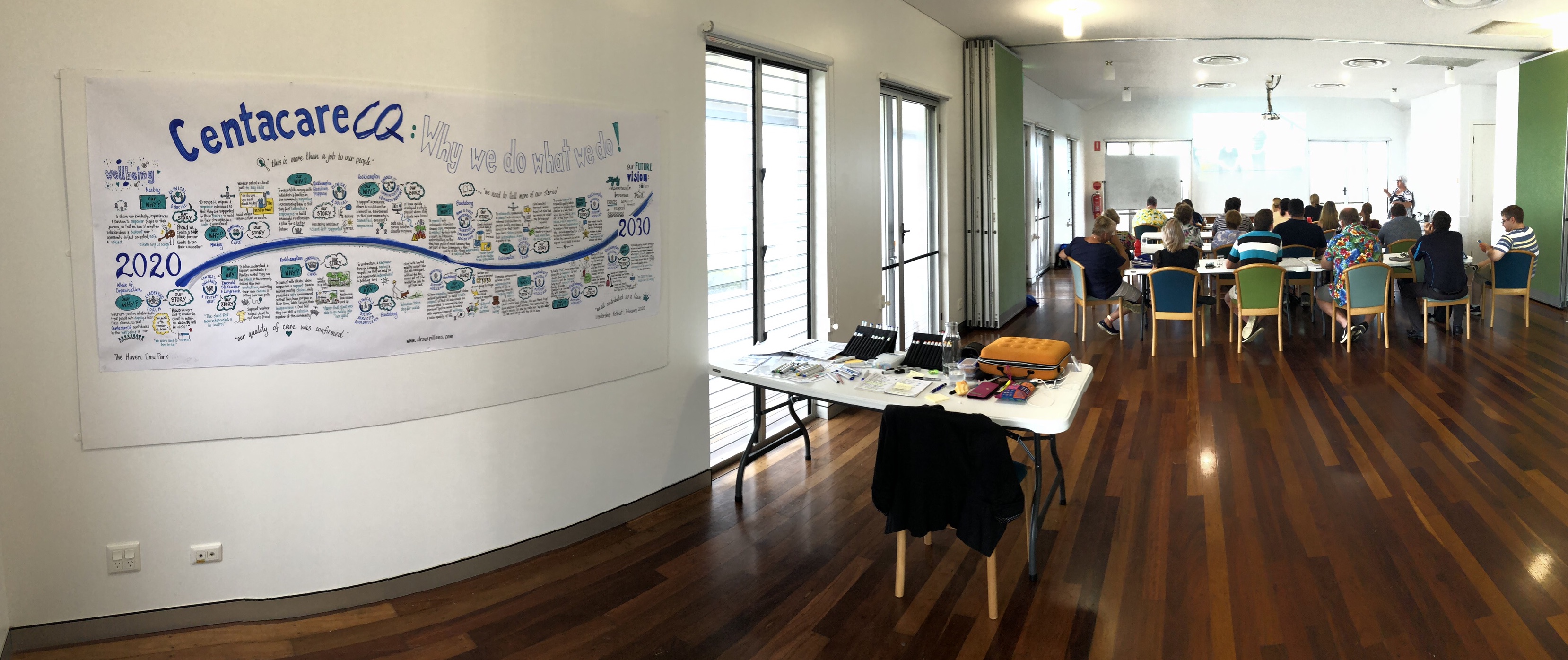 - Set up in the room – in a comfortable position where I can both hear and see the presentations; noting I can be on my feet for up to 10 hours a day as a graphic recorder