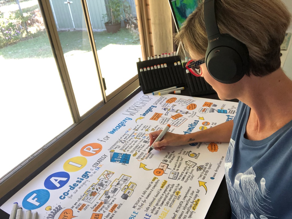 I also use my graphic recording skills to bring visual stories to life remotely with clients so everyone can share their stories! Depending on your visual needs I can graphically record any information that is provided to me, listen to online meetings or teleconferences and I can also visually capture online conversations and discussions through online streamlining services. If I can’t be in the room or online I also regularly visualise information which has been recorded via video/audio, podcasts, interviews, written meeting minutes etc.