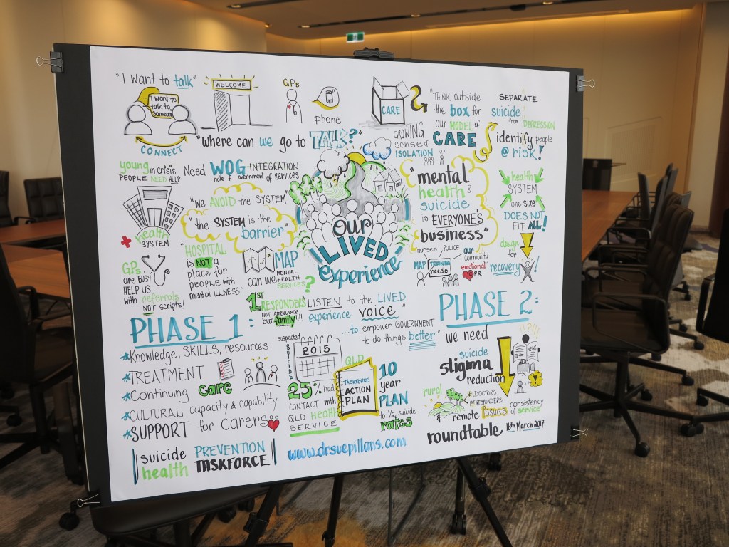 I pictured the discussions of the Queensland Suicide Prevention Health Taskforce hosted by the Health Minister at their Roundtable in Brisbane. I was there to listen to the Lived Experience voices and draw out their stories of courage and strength. A key message I heard was that “Mental Health and Suicide is everyone’s business“.