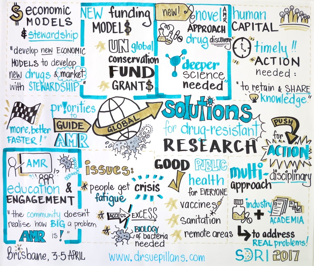 I was the graphic recorder for the Inaugural “Solutions for Drug-Resistant Infections” Conference held in Brisbane. I was there to draw out the Panel discussions and priorities to guide research efforts towards global solutions for drug-resistance research. Conference attendees voted on the top three research priorities which you can see pictured in the visual below.