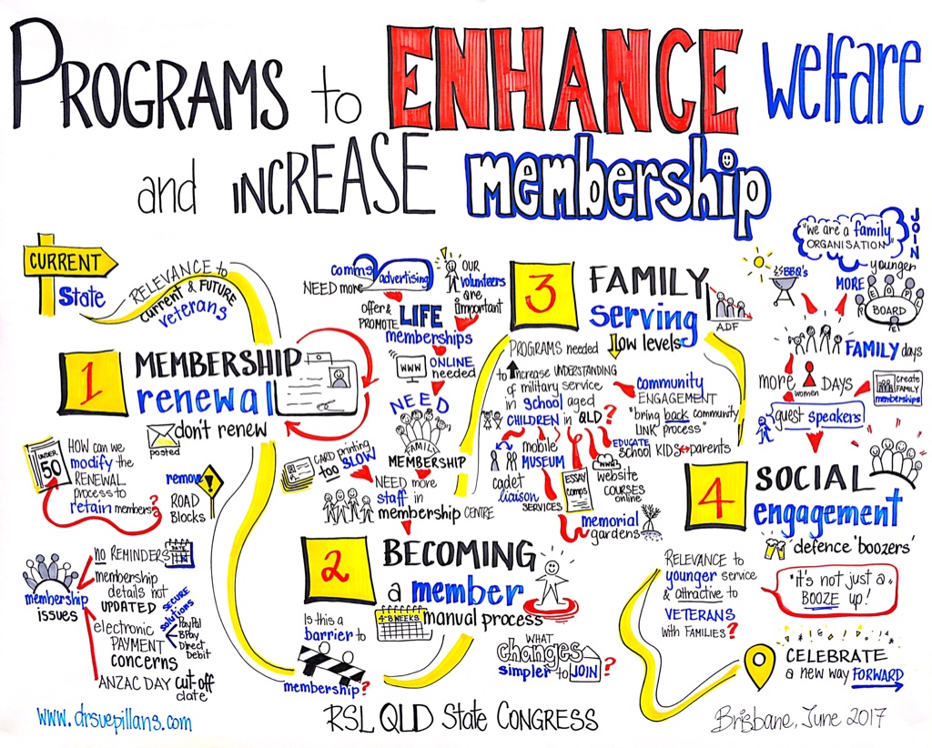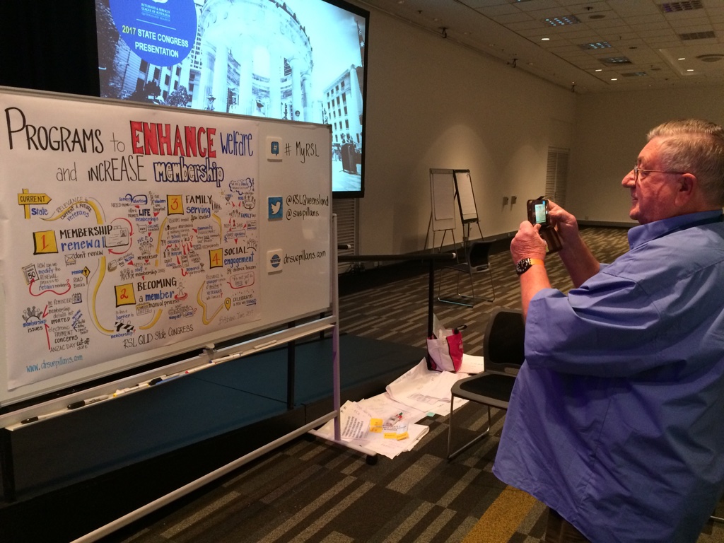 I was proud to draw out the discussions of the Returned and Services League (RSL) Queensland Branch’s State Congress held in Brisbane. I graphically recorded the Breakout Workshops which focused on “Programs to enhance welfare and increase membership“. As you can see from the visual story and photos the RSL Branch members in Queensland are wanting to remain relevant for current and future veterans and work towards celebrating the next 100 years of the RSL. I was so happy to see that the RSL members were so engaged with the drawing process and their story unfolding before them!