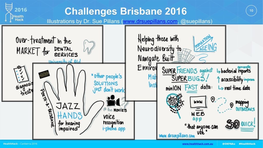 I was privileged to be the Sketchnoter for the 2016 HealthHack in Brisbane. My first ever Hackathon and what a dynamic and innovative group of hackers! HealthHack brings together motivated people from diverse professional and educational backgrounds together to solve important problems in healthcare and medical research. I just love being involved in collaborations that bring different people and their skills and experiences together. I drew the very quick (3-5 minutes) sketchnotes ‘live’ for the pitches, which ranged from fighting superbugs, tracking antibiotic resistant bacteria to helping the deaf enjoy a cinema experience. You can see how I pictured the HealthHack ideas and solutions through the HealthHack Story.