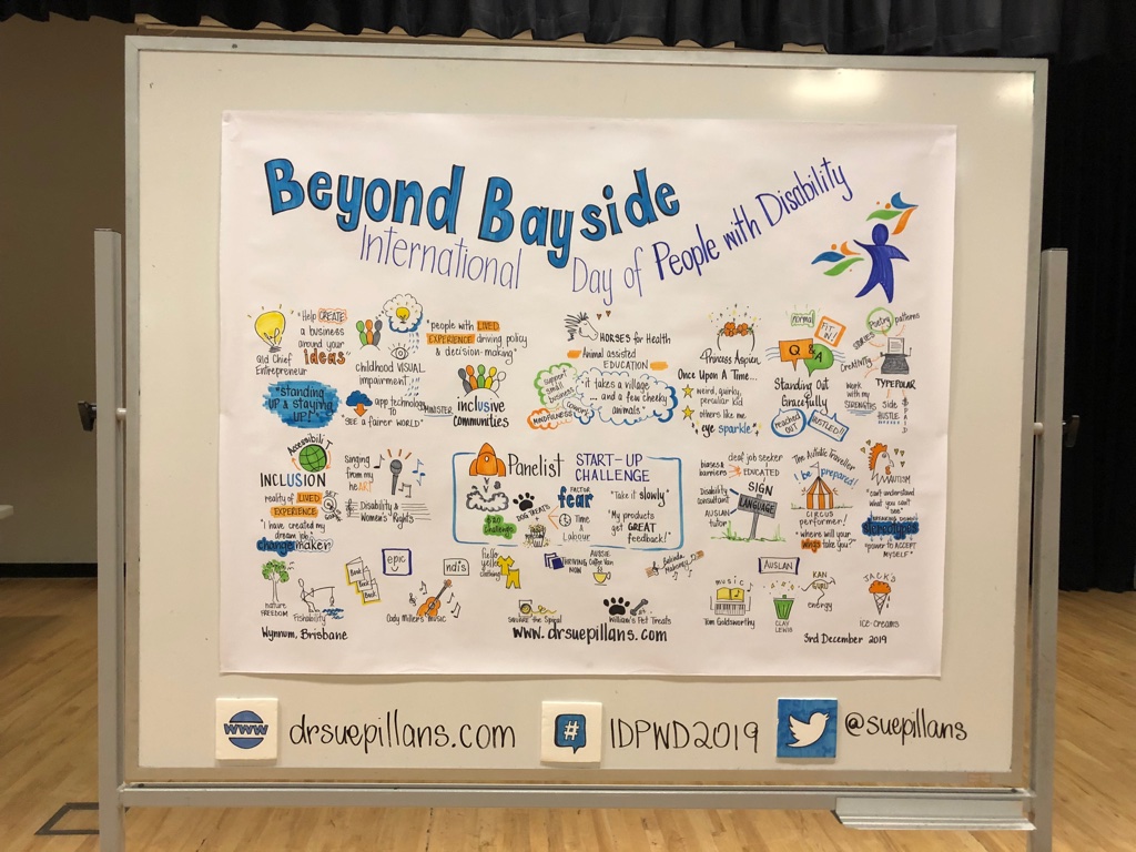It was an honour to draw attention to and celebrate the International Day of People with Disability at the “Beyond Bayside” event. This event showcased disabled entrepreneurs, speakers and performers and their stories of running their own businesses was extremely inspiring. Thank you so much for the opportunity to “picture” your amazing and inspiring stories. You can see more of this visual story over at https://drsuepillans.com/recording/business-industry/