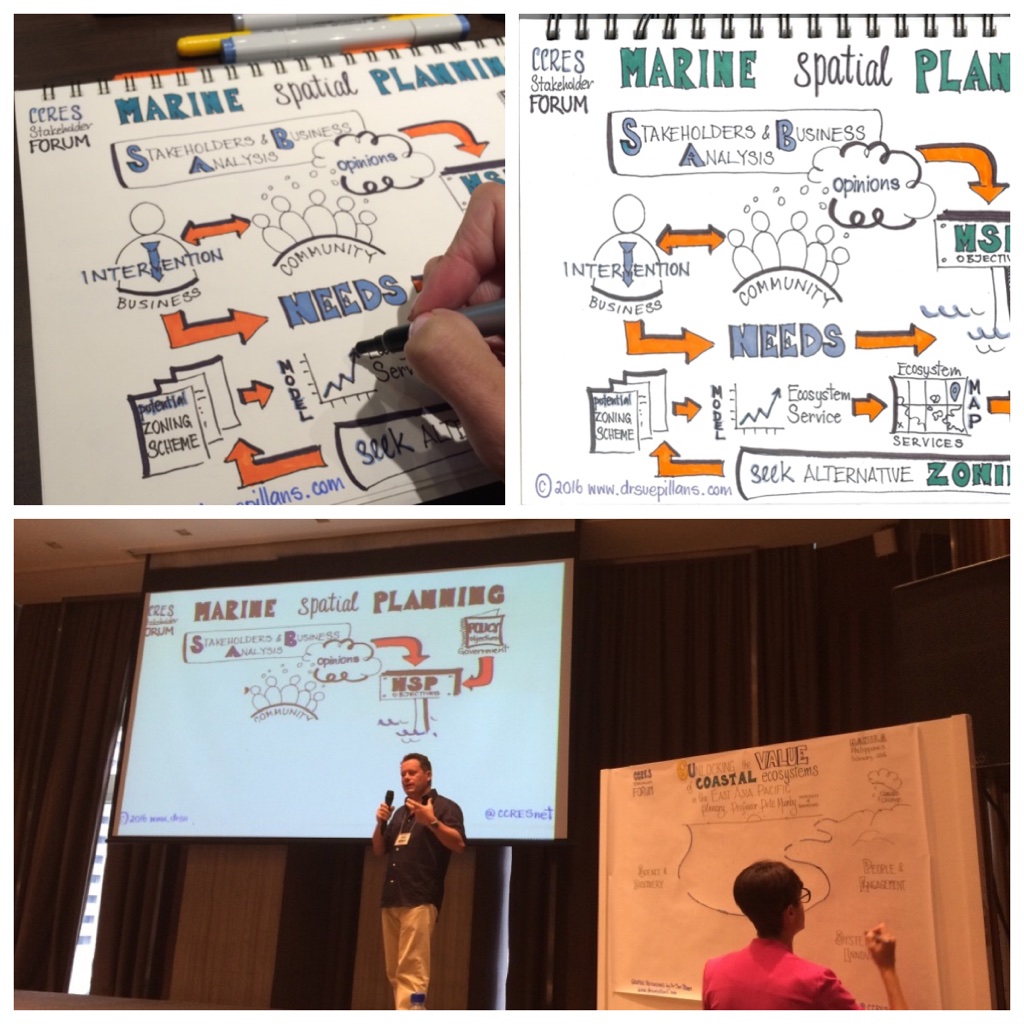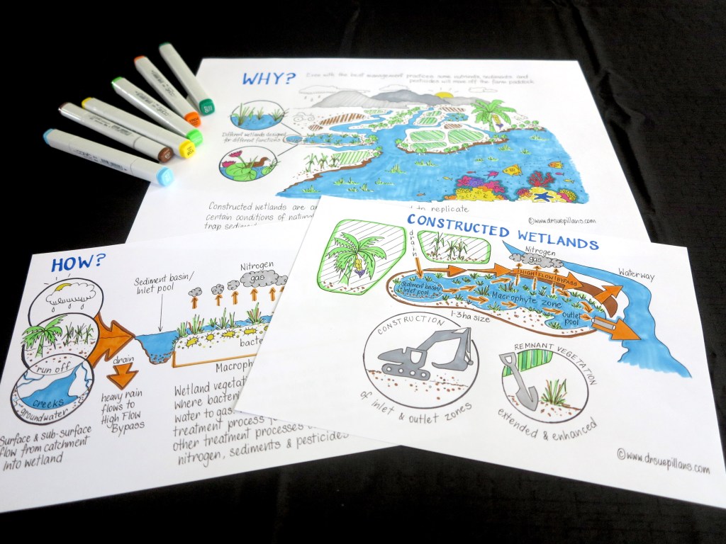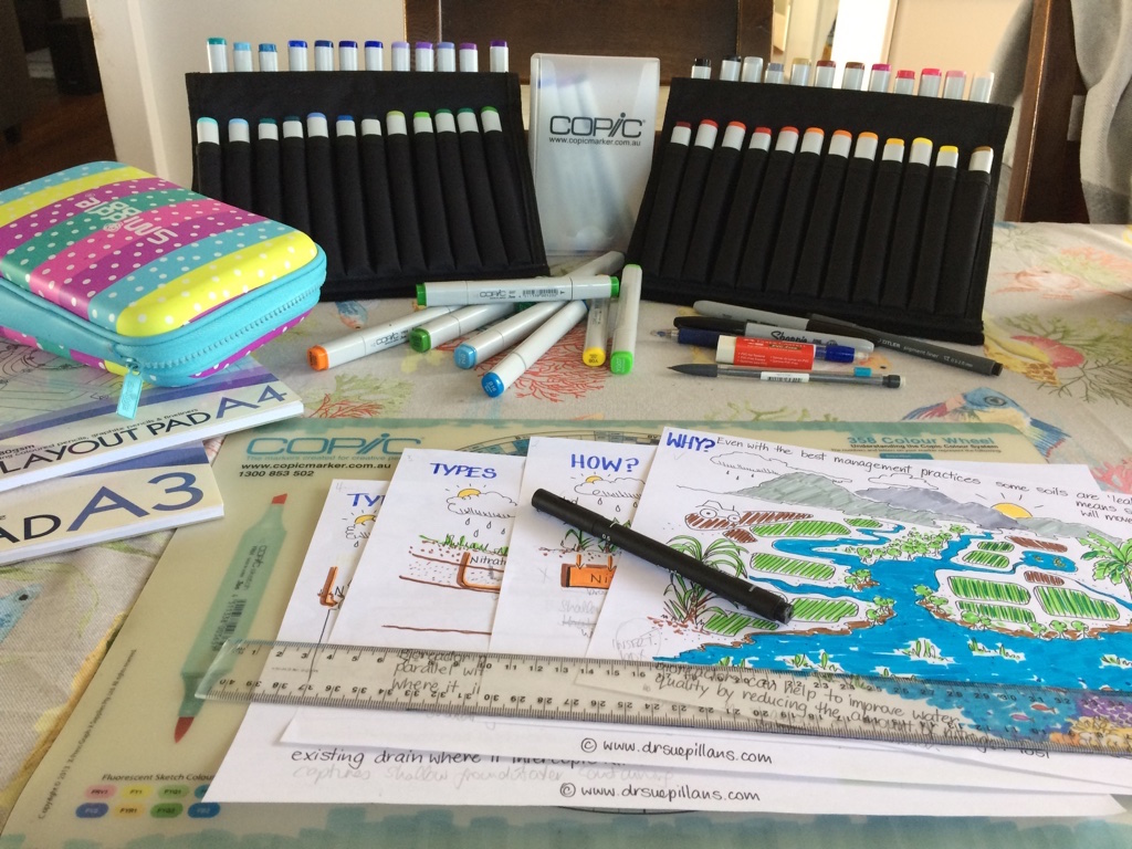 As you can ‘sea’ from the photos below the creative collaboration to create drawings for complex issues such as this is a staged approach which includes me: interpreting the information and science presented, creating the Mock-Ups, illustrating the information in black and white and finishing up with coloured illustrations — which are then turned into informative infographics!