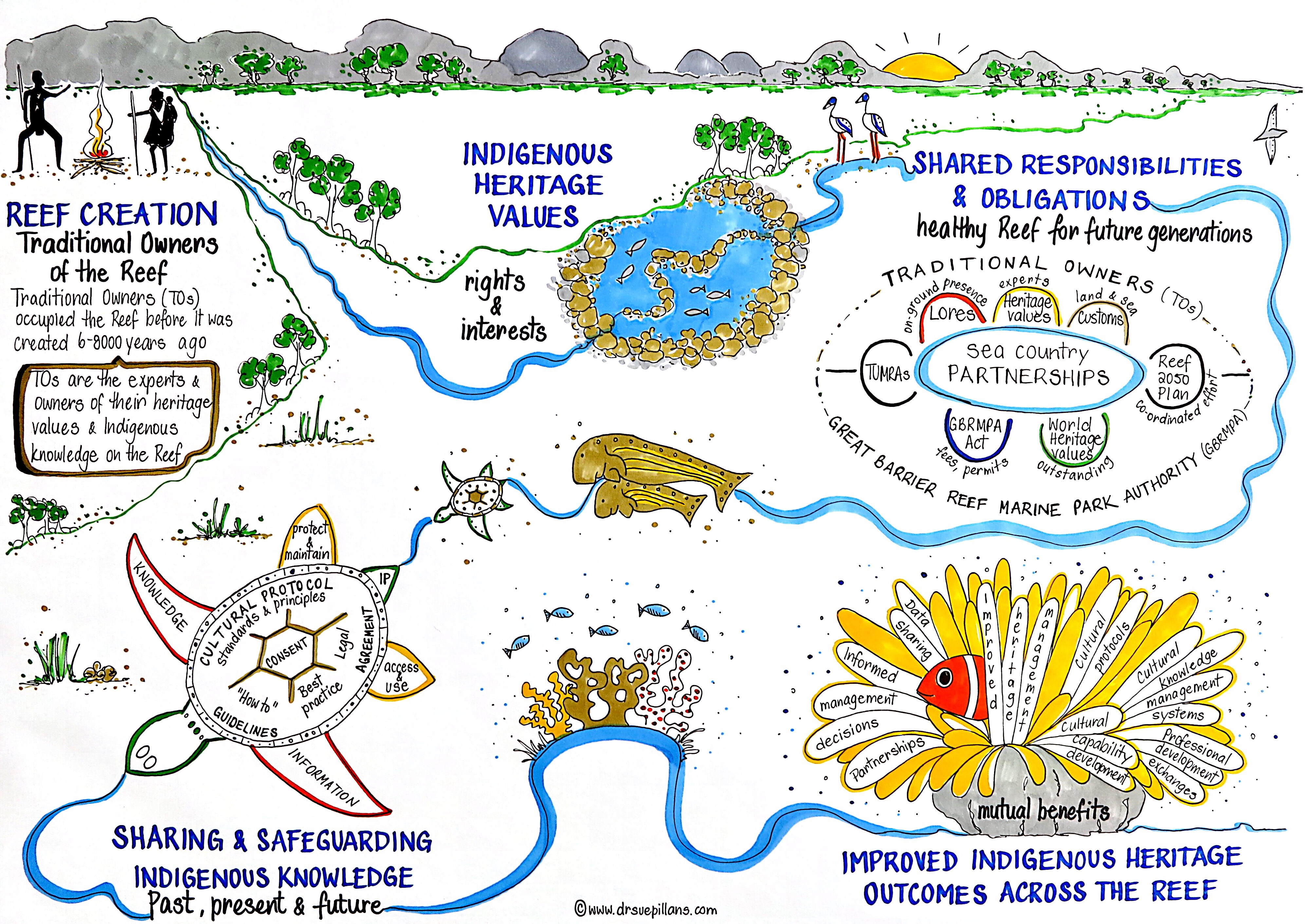 I was engaged by the Great Barrier Reef Marine Park Authority (GBRMPA) to co-create an infographic to picture the important story of the Traditional Owner (TO) journey through the Reef 2050 Integrated Monitoring and Reporting Program (RIMReP). GBRMPA wanted to increase Traditional Owner awareness and understanding about the RIMReP, how it will support improved protection and management of the Reef and the various ways Traditional Owners can be involved in RIMReP.