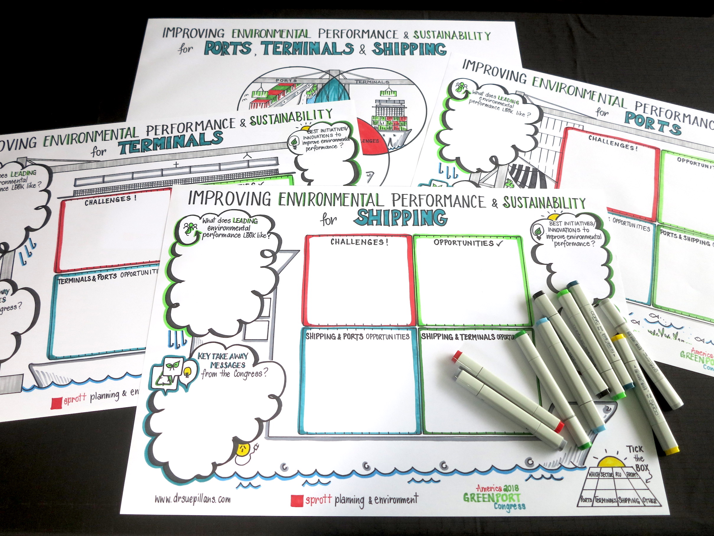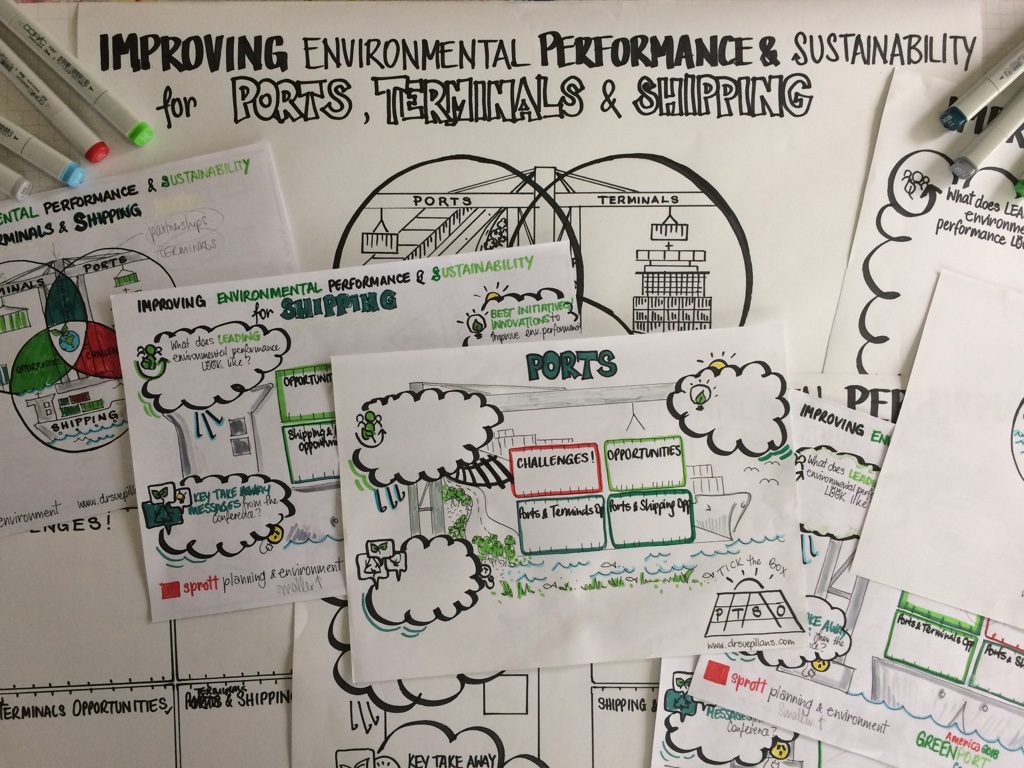 It was great to be engaged by Sprott Planning & Environment to create some unique templates for the 2018 American GreenPort Congress. My clients are hosting a workshop at the Congress and wanted to engage participants with templates that would be visually appealing and gather their feedback without using the ‘usual’ butchers paper exercise! As you can ‘sea’ the creation of these templates is a staged process working from the initial discussion with my clients through to the creation of mock-ups and then the black and white drawings to the FINAL coloured templates!