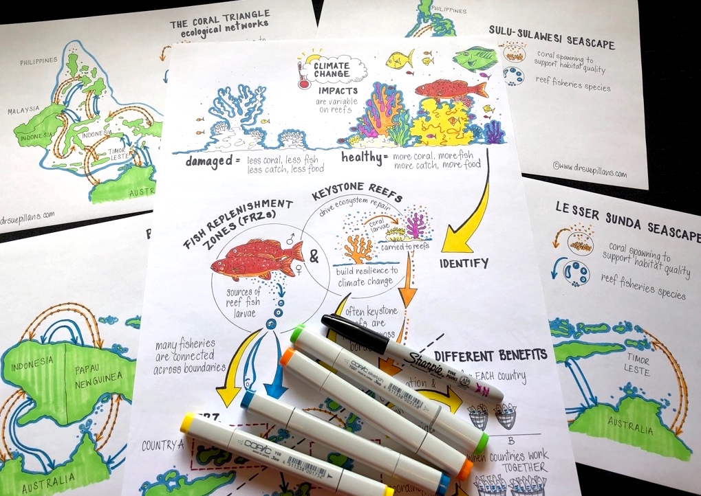 It’s always a great delight for me as a marine scientist to be able to illustrate concepts and information to help managers and stakeholders of our marine resources. Here is a sneak peak of some drawings I have created for a proposal and presentation to help picture the importance of protecting marine biodiversity and managing fisheries in The Coral Triangle.