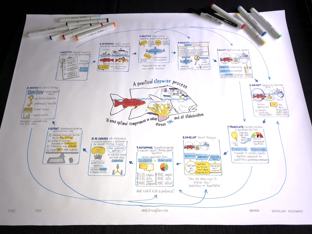 Below are examples of how I created an infographic for a CSIRO webinar which summarised a large Powerpoint presentation in which each of the steps were also drawn out and then used throughout the webinar. Thanks to Natalie and the team for having me along to help “Picture your presentation“!