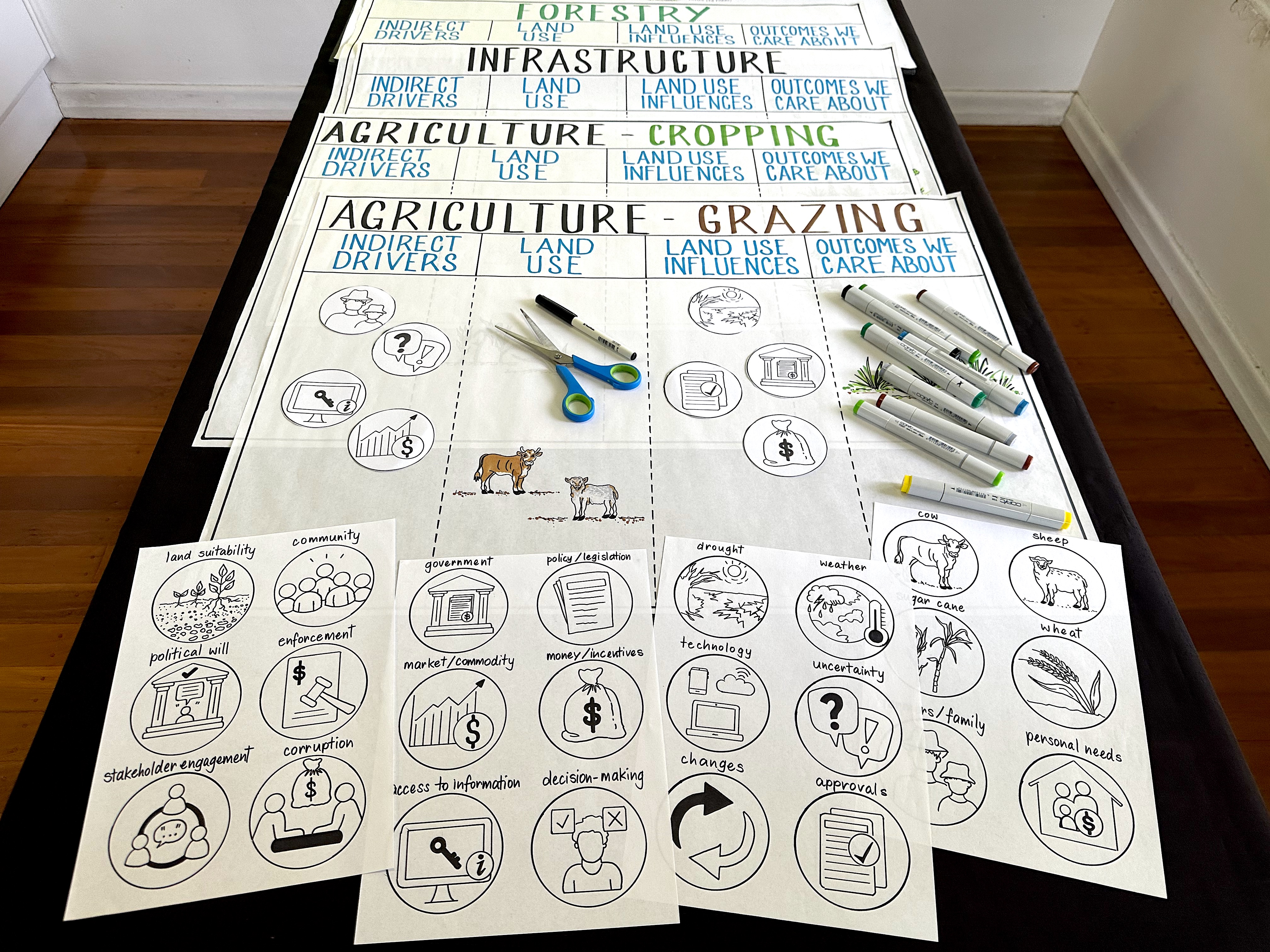 These hand drawn icons and templates were created based upon emerging results from a three-stage expert elicitation process examining the drivers of land clearing. And it was SO great to see the attendees using the visuals at the workshop to quickly illustrate the complexity and multi-dimensional nature of drivers influencing land clearing in Australia.