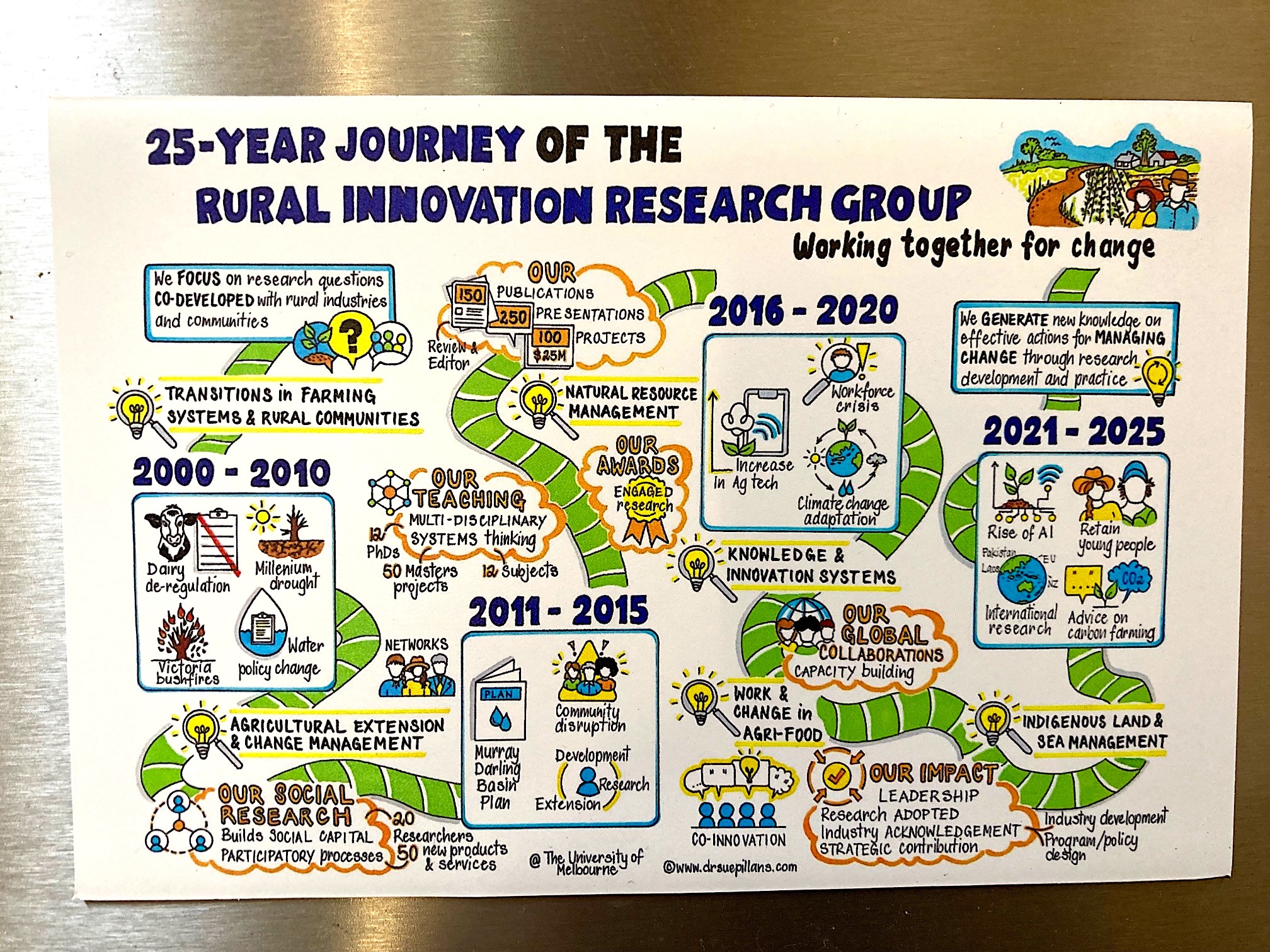Whilst the final visual stories may look ‘simple’ in nature, they were created based upon detailed information and team feedback, with much of my time reviewing, synthesising and translating the key parts of the RIRG team story to create a 25-year journey. That’s why I love using visual storytelling to help make the complex simple and the simple compelling.