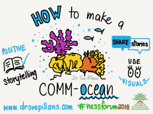 I was delighted to be invited to present at the Network of Environmental and Social Scientists (NESS) Annual Forum held at The University of Queensland, which focused on “Communicating to protect the environment“. I presented on “How to make a comm-ocean” using the art and science of storytelling, whilst also live sketchnoting the other presentations. What a great day of storytelling to communicate to protect the environment.